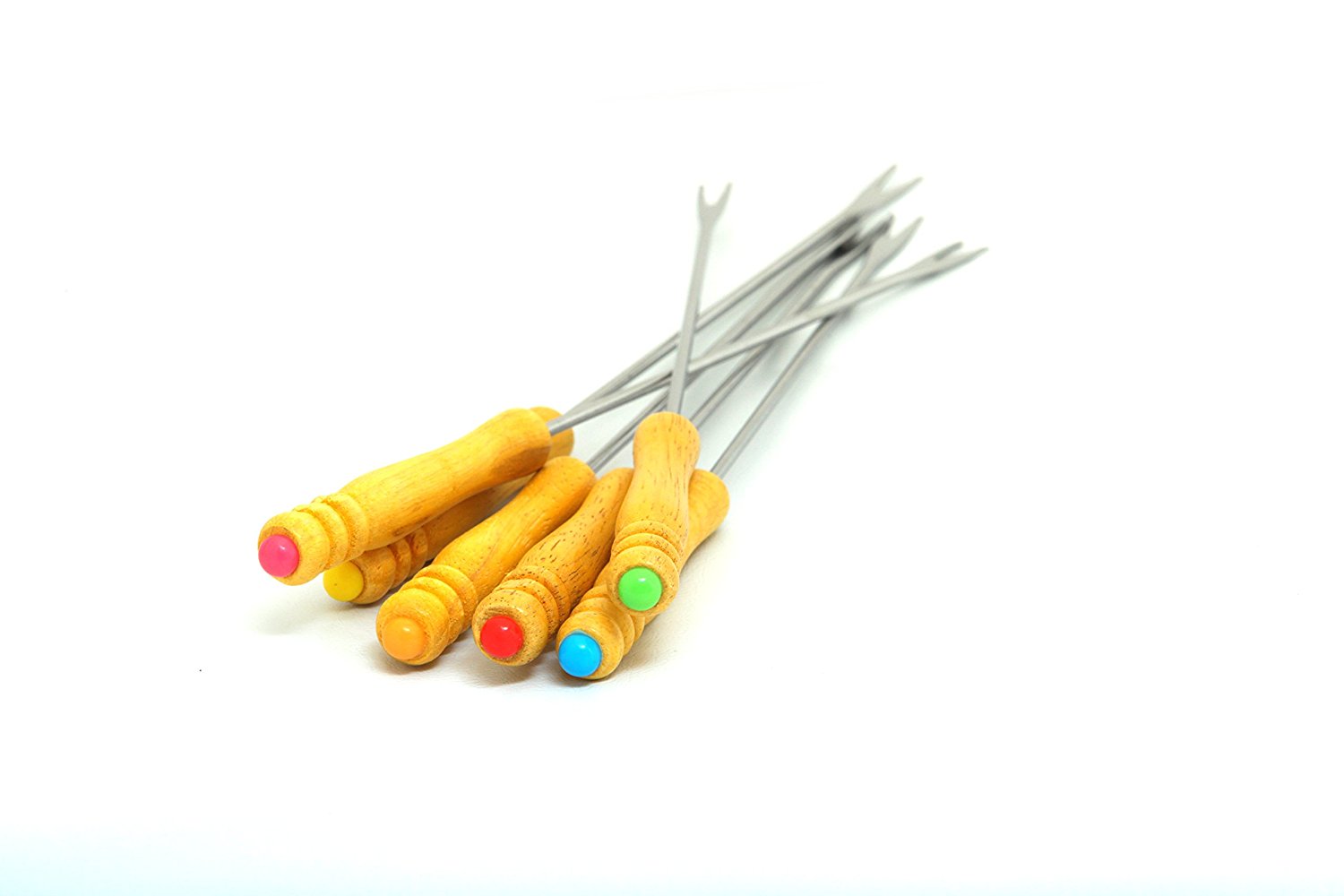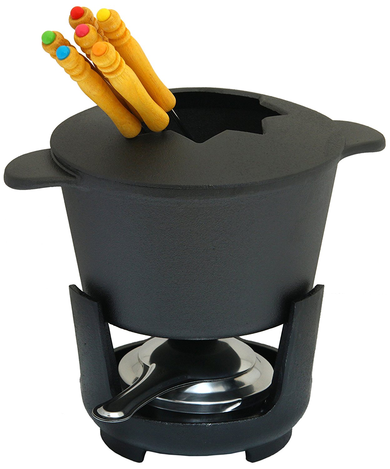 This set includes a 1.47QT pot, a base, alcohol burner and six 9" fondue forks with wood handles.