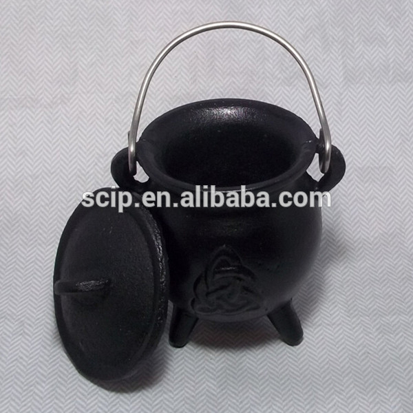 Bu siyahı hər iki tərəfində Triquetra motivi olan kiçik, qara çuqun qazan üçündür. Bir polad tutacaq və çuqun qapaq ilə gəlir. Bu qazan təxminən 4-1/2 "hündürlükdə və təxminən 3" enində ölçür. Alterinizdə istifadə etmək və ya otlar və ləkələri yandırmaq üçün yaxşı ölçülü bir "qarın" var. Yanğını söndürmək və ya tüstünü idarə etmək istədiyiniz zaman qapaq əladır. yaxşı hazırlanmış və möhkəmdir, ölçüsünə görə ağırdır.