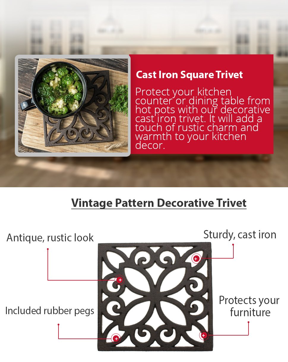 Decorative Cast Iron Trivet For Kitchen Or Dining Table -| Square with Vintage Pattern – 6.5 x 6.5 – With Rubber Pegs/Feet