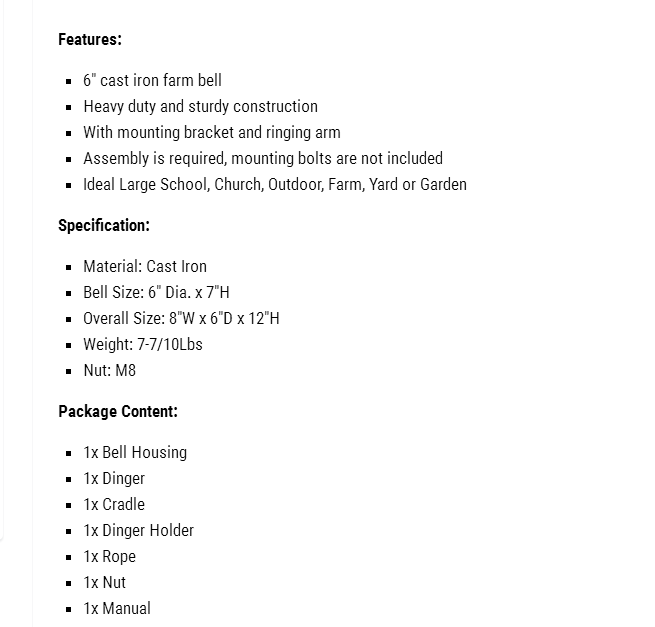 6in Outdoor Cast Iron Dinner Bell School Farm Church Bell – KASITE , The product will supply to all over the world, such as: Thailand