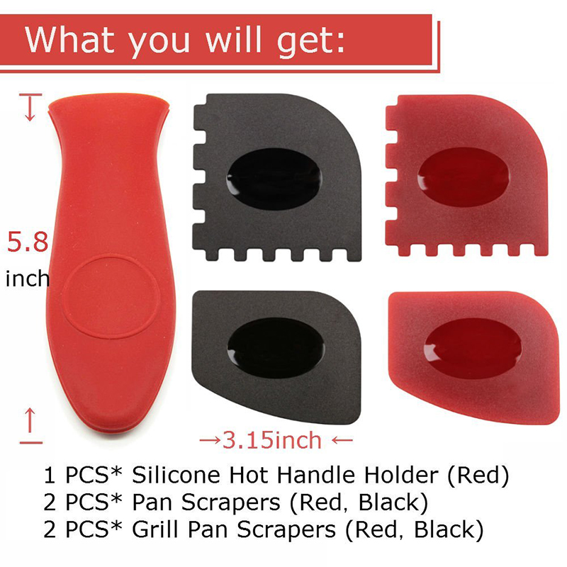 | ნივთის სახელი | 5-IN-1 კომპლექტი, საშუალო ზომის სილიკონის ცხელი სახელურის დამჭერი + გამძლე გრილის ტაფის საფხეკები (2 ცალი) + გამძლე საფხეკები (2 ცალი) თუჯის ლოჯისთვის | |||||||||