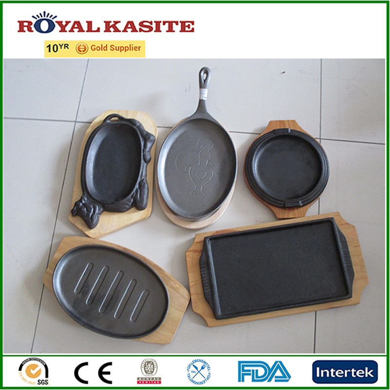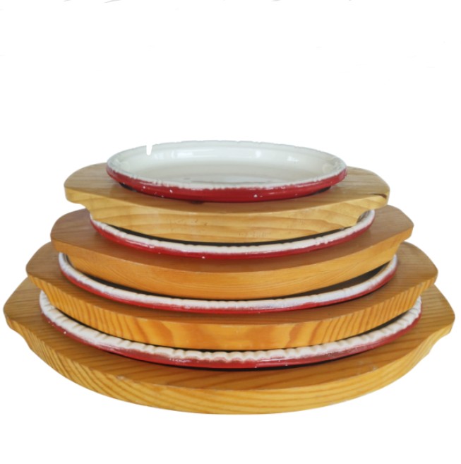 ខ្ទះដែកធ្វើពីដែក fajita រាងមូល sizzler plater grill pan with wood birch tray, Pre-seasoned from 13 years gold supplier