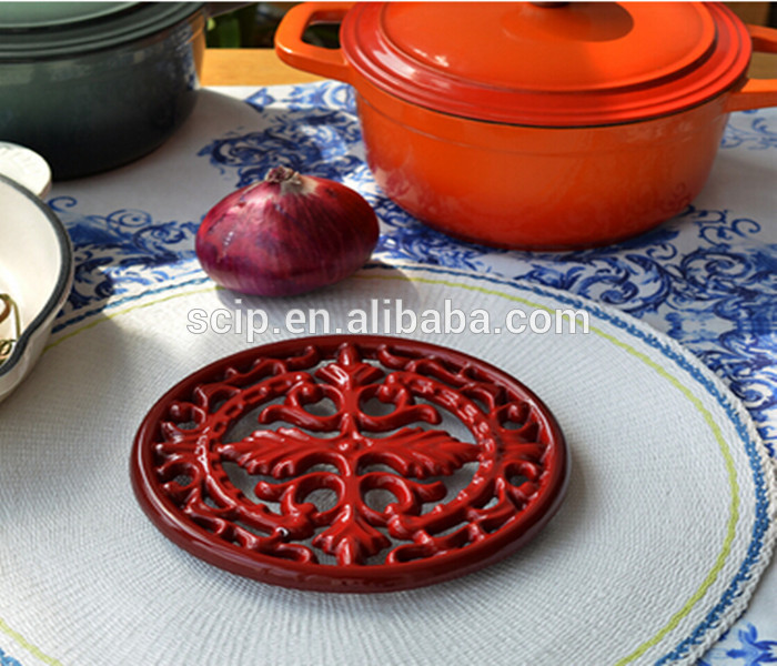 Bring country charm to your kitchen or dinner table with this pastoral trivet by Geovein. Crafted with non-reactive cast iron, this bright satin red trivet is decorated with the homey image of flower.