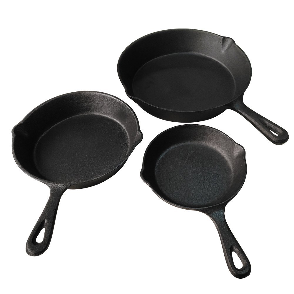 - 3-piece set consists of 6.5-inch skillet, 8-inch skillet, and 10.5-inch skillet