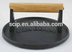 round Cast iron meat grill press with wooden handle.