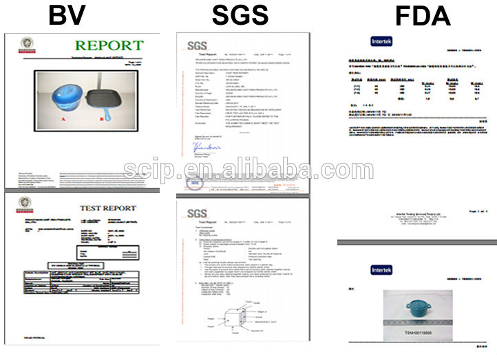 With over 15 years experience of producing  cast iron product,our company has gained a good  reputation in oversea market,and  we can supply approval test certificates by SGS ITS FDA LFGB CMA and FOOD SAFETY CONTACT APPROVAL.Besides ,factory aduit experience carried out by US Wal-mart, SEARS&K-MART,  Finland KESKO. and we have just carried out BSCI certification in  Jan 2015.