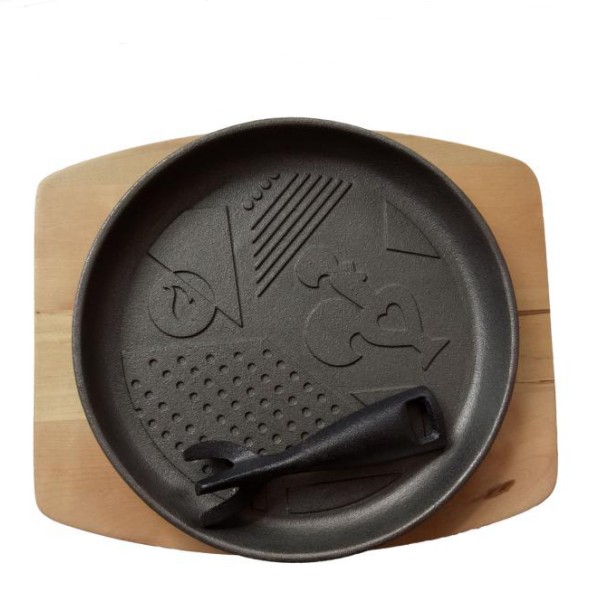กระทะซิซซ์เล่อร์จานเหล็กหล่อฟาฮิต้าพร้อมถาดไม้เบิร์ช ปรุงรสล่วงหน้า